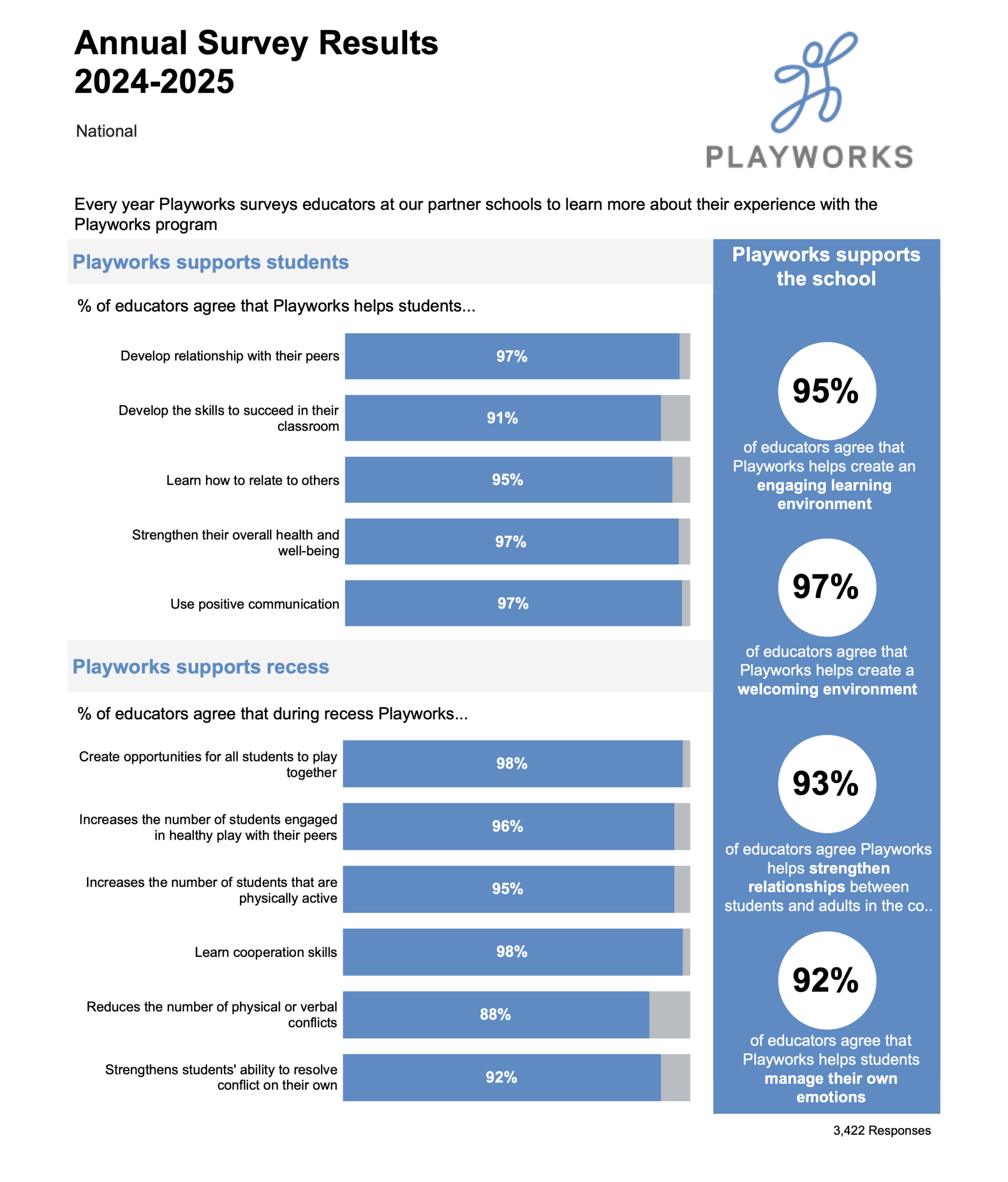 Playworks conducts an annual survey of school staff for the purpose of learning more about our impact on students and schools as we learn about areas we can improve our programming. The survey covers student behavior throughout the school day. The survey is a combination of likert scale rating questions as well as open-ended questions.