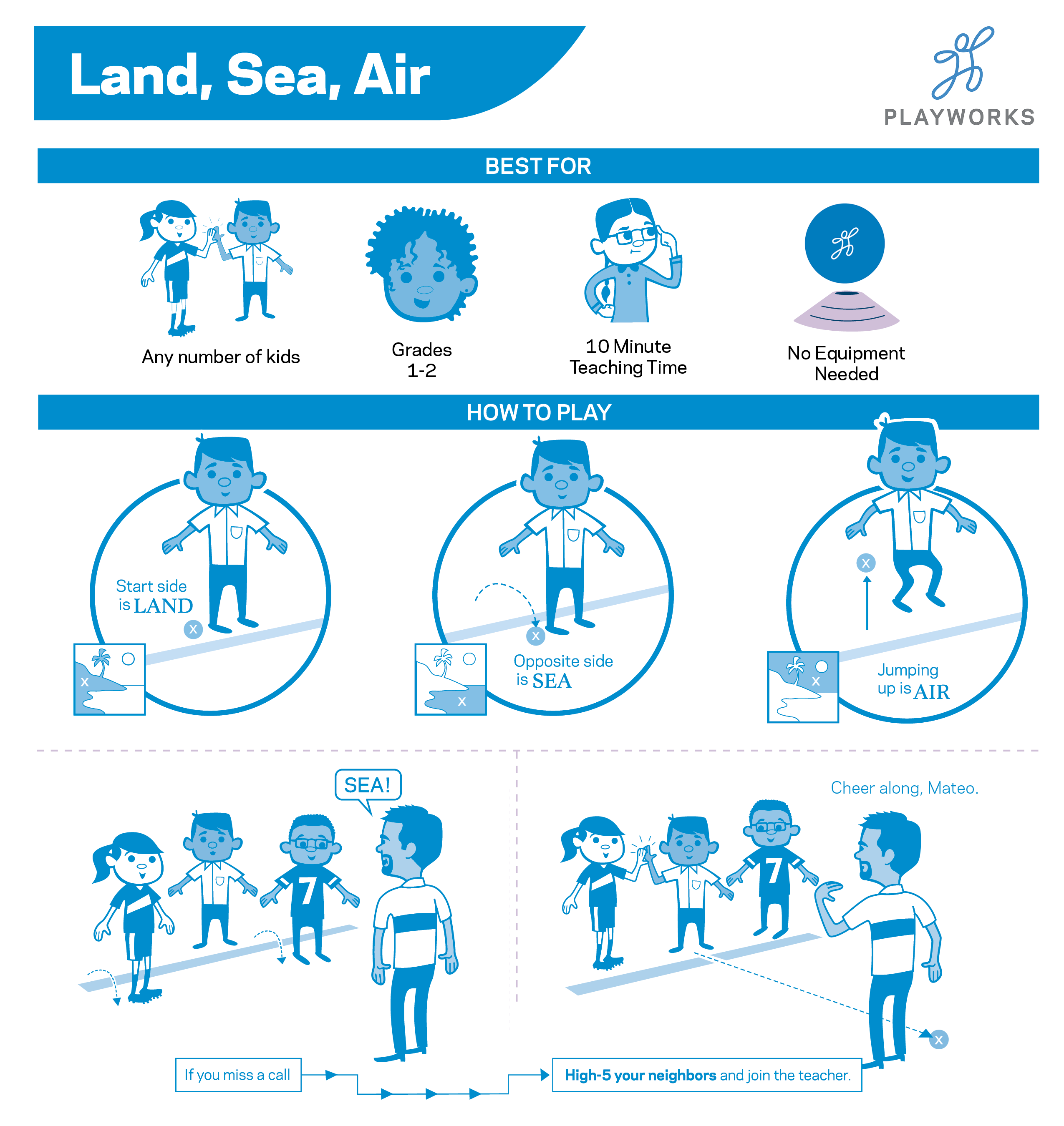 - The leader will call out commands—”land,” “sea,” or “air.”