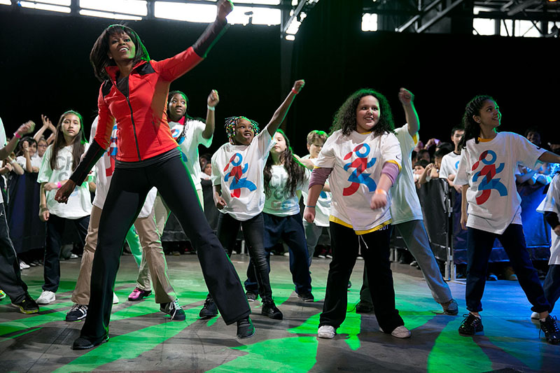 First Lady Michelle Obama, athletes, and children do exercises during a “Let’s Move! Active Schools” event at McCormick Place in Chicago, Illinois, Feb. 28, 2013. The event is part of the First Lady’s “Let’s Move!” initiative third anniversary tour. (Official White House Photo by Lawrence Jackson)