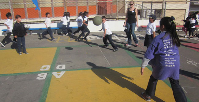 Soon after his arrival, I decided to play four square during class game time. Although the rest of the class knew the game, Rio didn’t appear to be familiar with it. His classmates helped him even though he had difficulty understanding what was being said to him. In one instance during that class, one of his classmates gently pushed him from the front of the line into the “D” square when it was his turn to enter. Rio caught on after watching demonstrations from his classmates. By the end of the class game time he was doing fine.