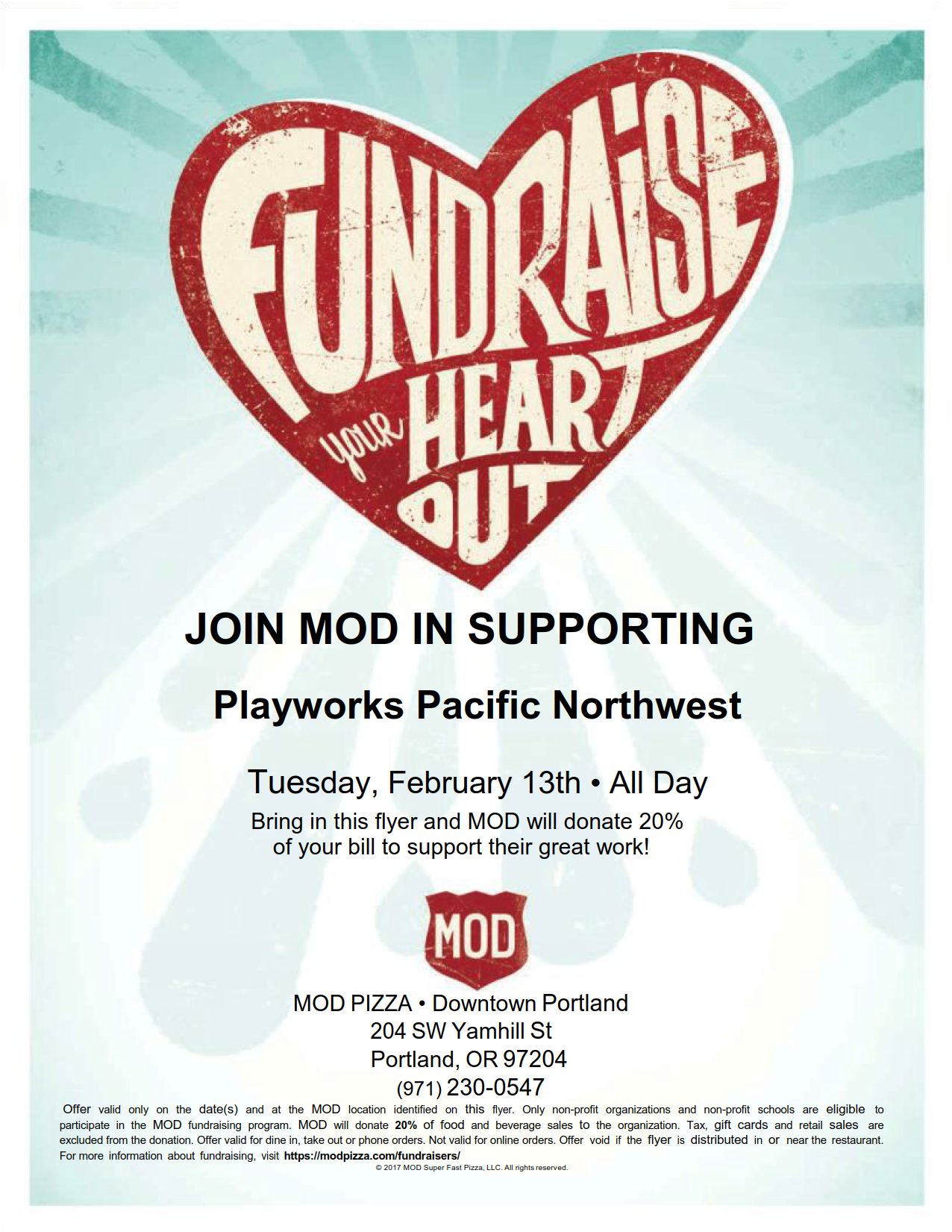 Tax, gift cards, and retail sales are excluded from the donation. Offer is valid for dine-in, take-out, or phone orders. Not valid for online orders. Offer is void if the flyer is distributed in or near the restaurant.