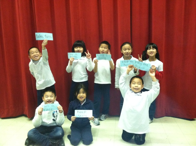 In the beginning of the year Ms. Chen, one of the ESOL teachers, asked if her classes could be added to my regular Class Game Time schedule, when I go to individual classes and work with them and the teacher to teach games and playground activities. I welcomed the challenge and reviewed some helpful ESOL teaching strategies with her. During class we taught in English and Mandarin, using use visual aids for reference.