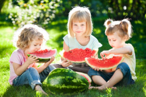 Media Children having picnic September 19, 2017 Group of happy children eating watermelon outdoors in spring park
