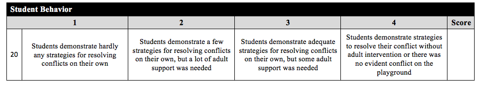 * Note: When scoring this question observers should consider negotiations between students as normative behavior. In this context, disagreements about rules refer to instances when students disagree/argue within the context of a game, and this disagreement disrupts the flow of the game, or impedes play for others.
