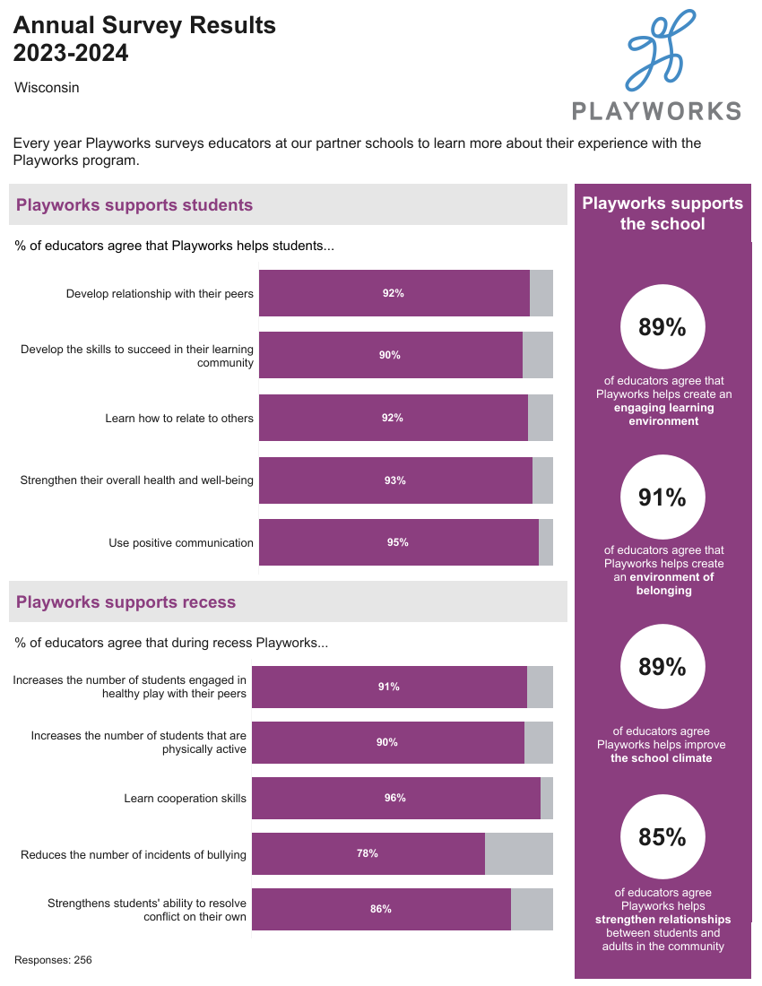 Playworks conducts an annual survey of school staff for the purpose of learning more about our impact on students and schools as we learn about areas we can improve our programming. The survey covers student behavior throughout the school day. The survey is a combination of likert scale rating questions as well as open-ended questions.
